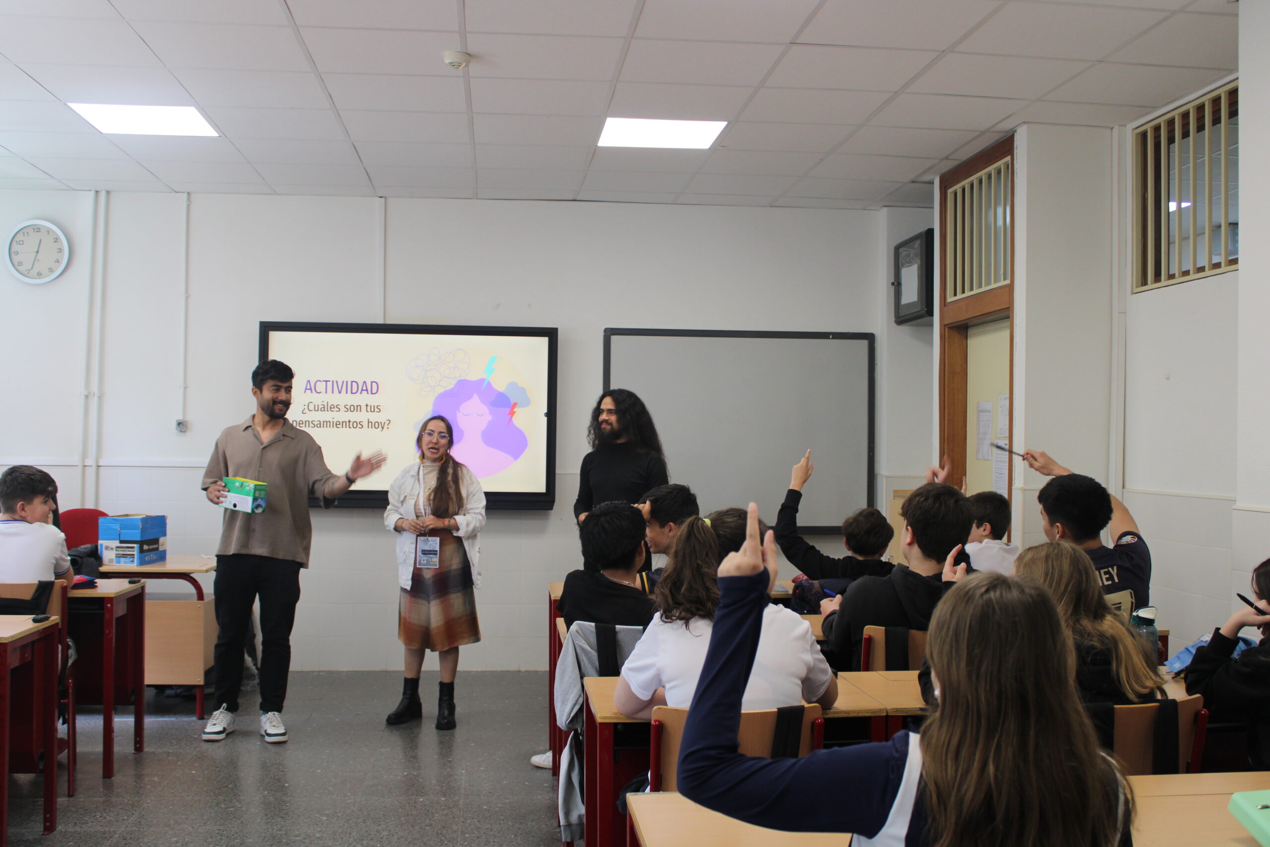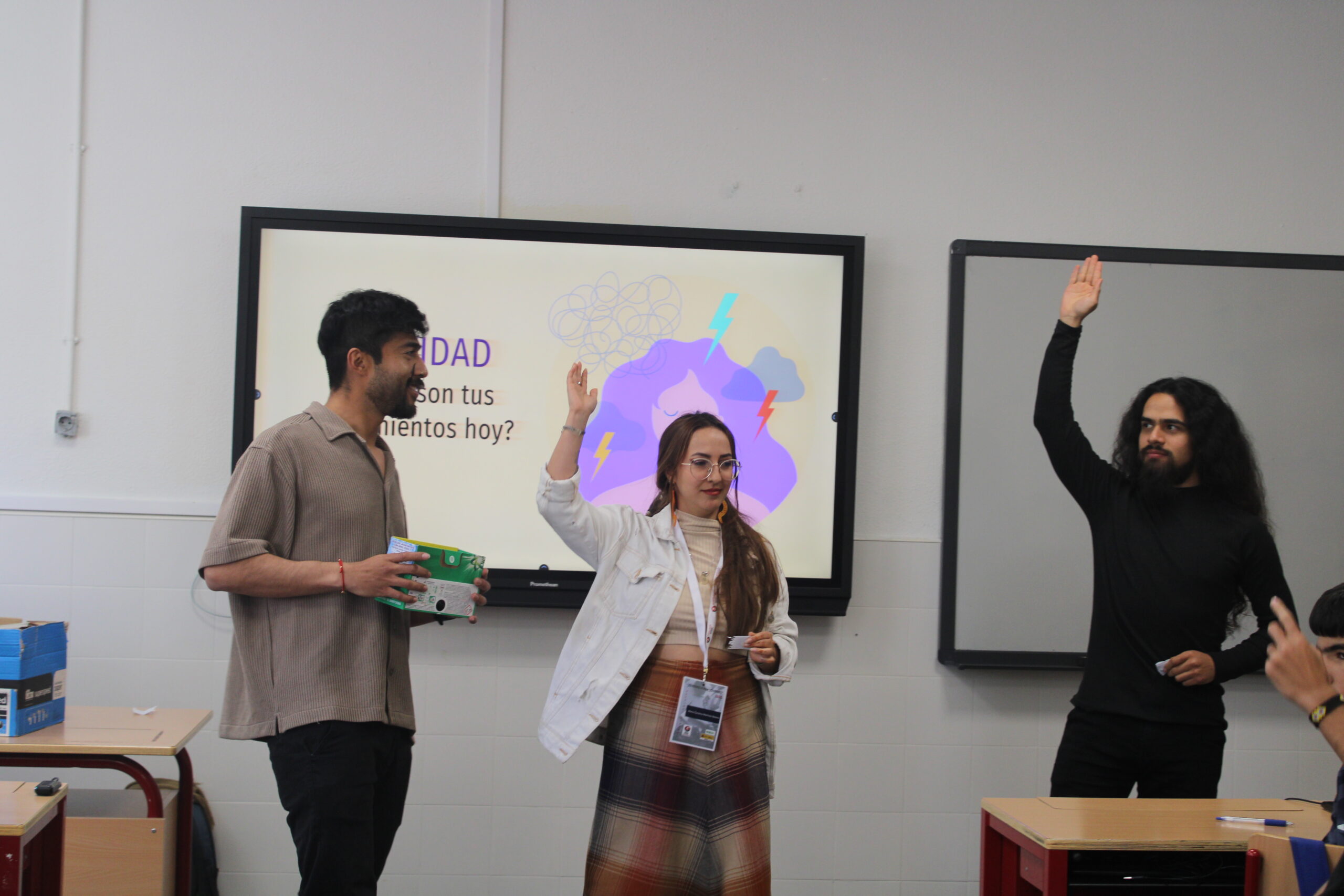 En Madrid realizaron el voluntariado Sergio Carreño, becario en el Máster Universitario en Estudios Avanzados en Educación Social UCM; Sebastián Moreno, becario en el Máster Universitario en Ingeniería Ambiental UPM; María Carolina Martínez Botero, becaria en el Máster Universitario en Análisis, Conservación y Restauración de Hábitats; y Micaela Cajape, excolaboradora de Red Carolina. El pasado 22 de abril impartieron un taller sobre salud mental a un grupo de alumnos de 2º de la ESO en un instituto de Majadahonda.