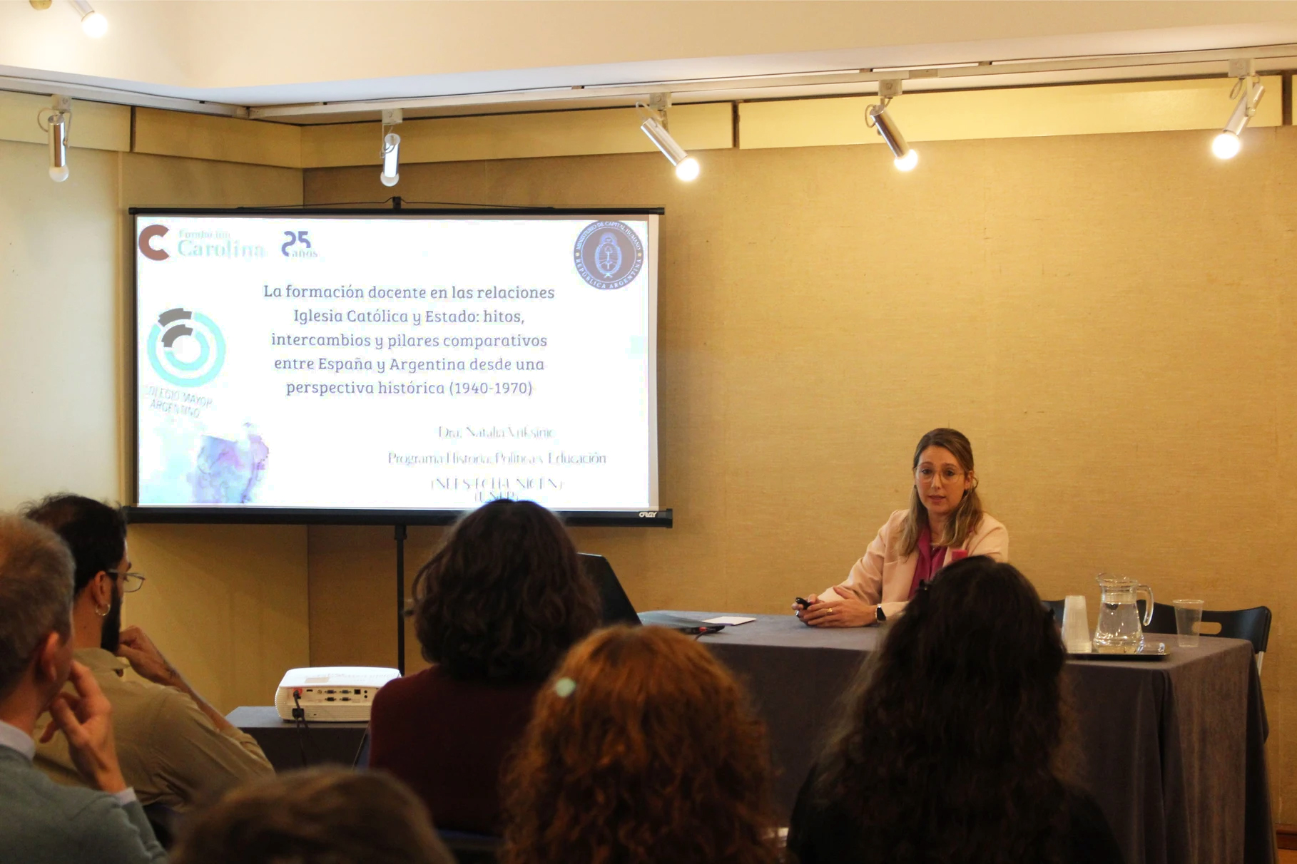 Natalia Isabel Vuksinic, doctora en Ciencias de la Educación, docente de la Facultad de Humanidades y Ciencias de la Educación, de la Universidad Nacional de La Plata, presentó la ponencia «La formación docente en las relaciones iglesia católica y Estado: hitos, intercambios y pilares comparativos entre España y Argentina desde una perspectiva histórica (1940-1970)».