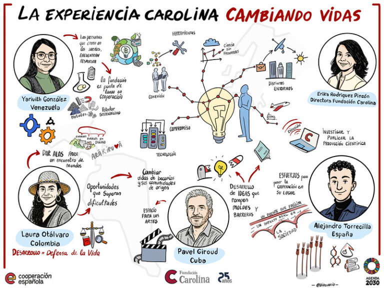 El graphic recording quedó como testigo de este diálogo, un mapa visual de aprendizajes, conexiones y transformación. Veinticinco años después, la Fundación Carolina sigue tejiendo historias que atraviesan fronteras y que recuerdan que la cooperación, la curiosidad y la imaginación son fuerzas capaces de transformar Iberoamérica.