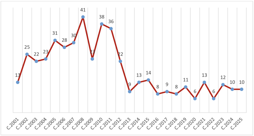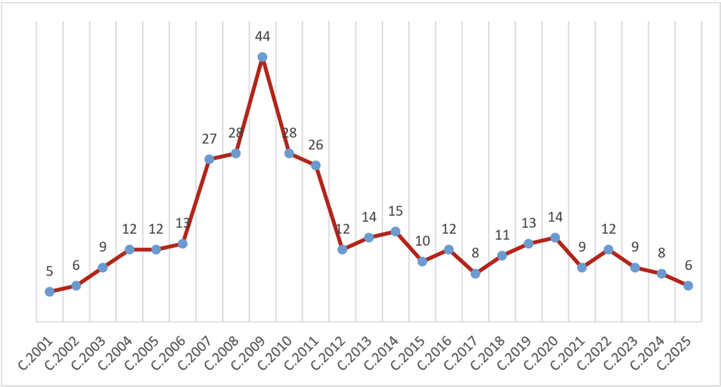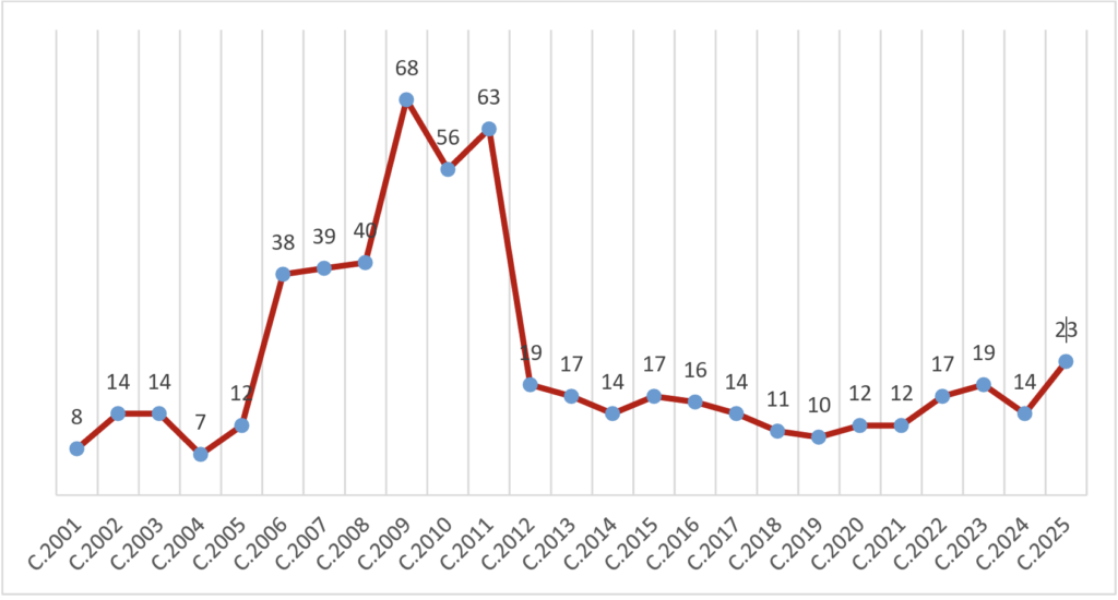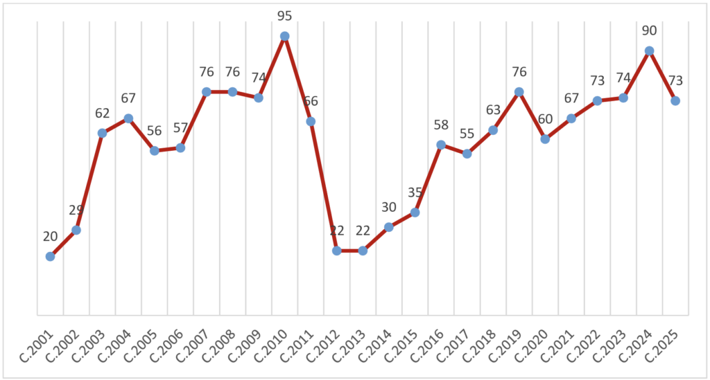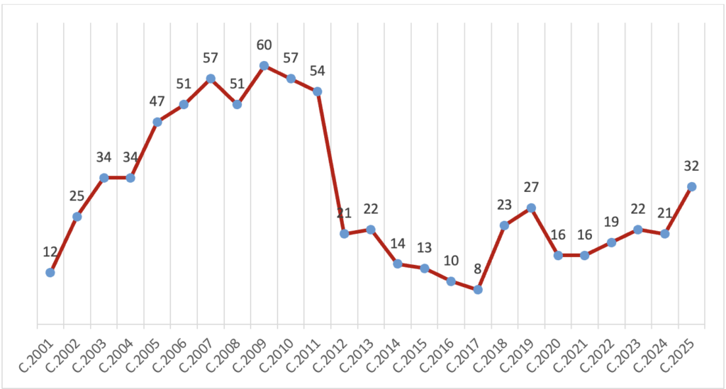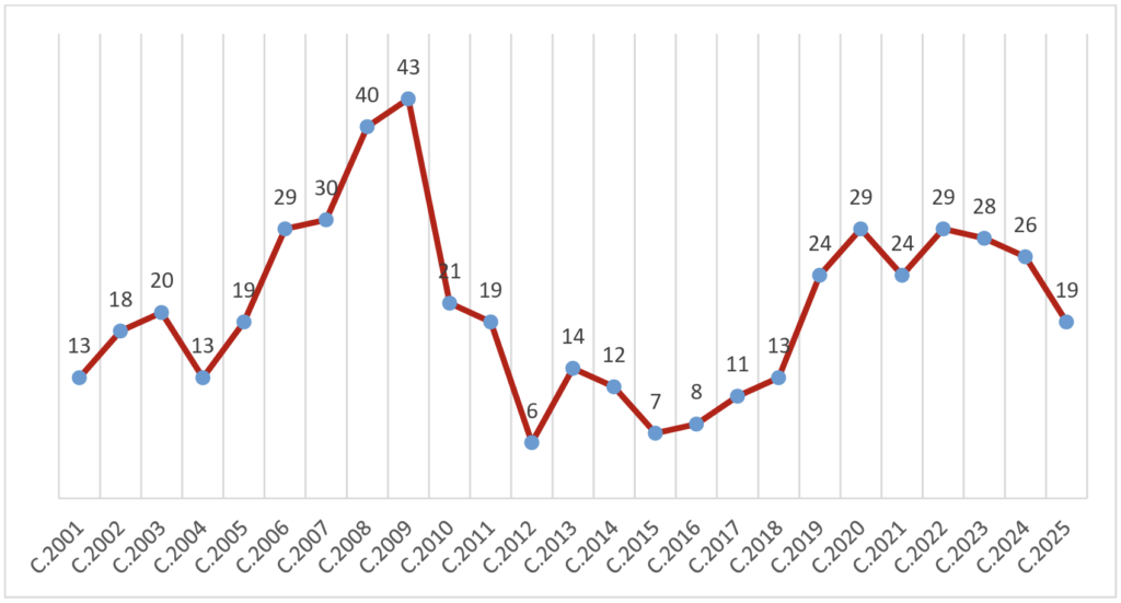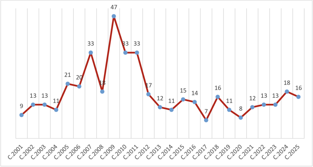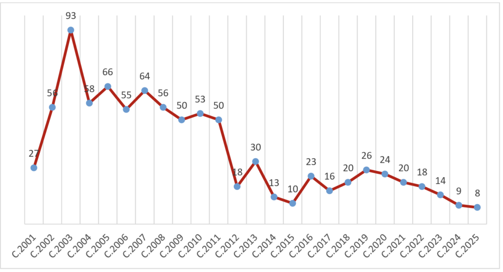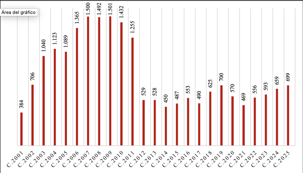 Becas concedidas por convocatoria anual (convocatorias 2001-2025)
