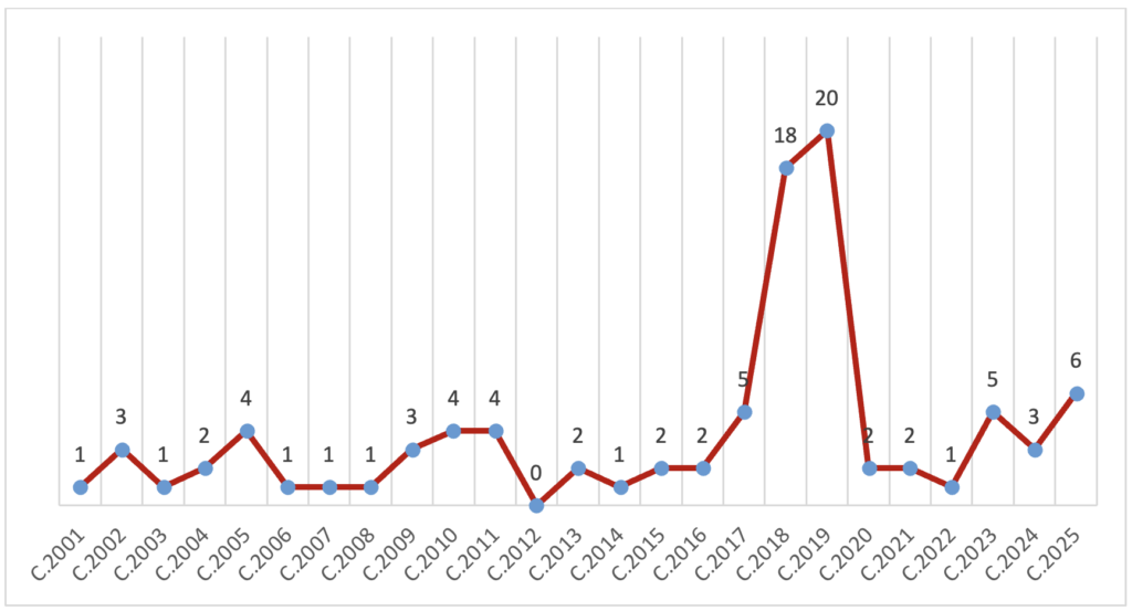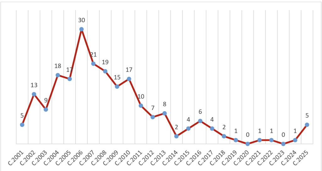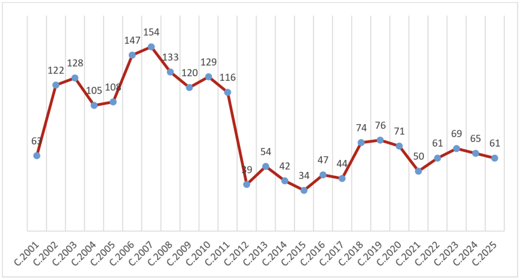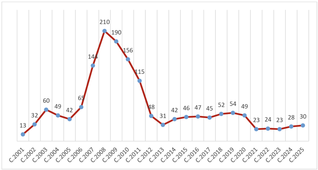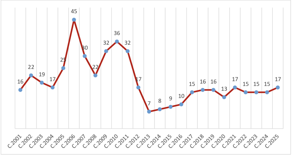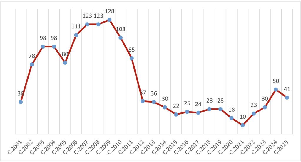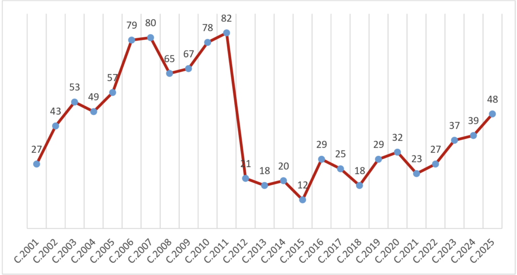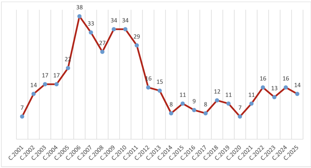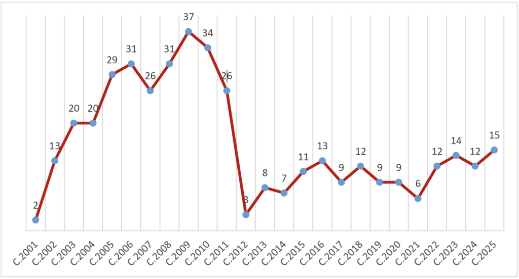 Becas concedidas por convocatoria anual (convocatorias 2001-2025)